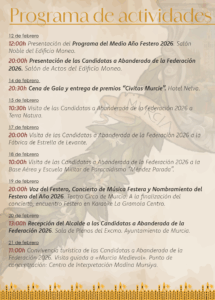 Revive cada año la historia de Murcia, desde la fundación de la ciudad por Abderramán II hasta la entrega de llaves al Infante Alfonso de Castilla, que posteriormente sería Alfonso X El Sabio. Historia y fiesta, en la que ambas se unen y se entrelazan mostrando a Murcia el esplendor de otras épocas.